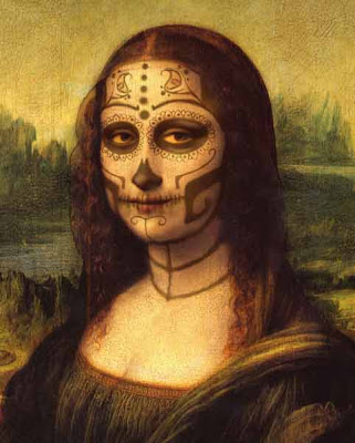 Oh dear, what have i done? Yes that's right.. I've gone and made our beloved Mona Lisa into a tragedy.. (don't worry its not the real Mona Lisa). I have a friend who was telling me that someone she knows was redecorating her kitchen or house for a day of the dead theme. So i got my inspiration.. and perhaps it was a little bit sinful to murdalate a great masterpiece like this. BUT IT FELT GOOD!